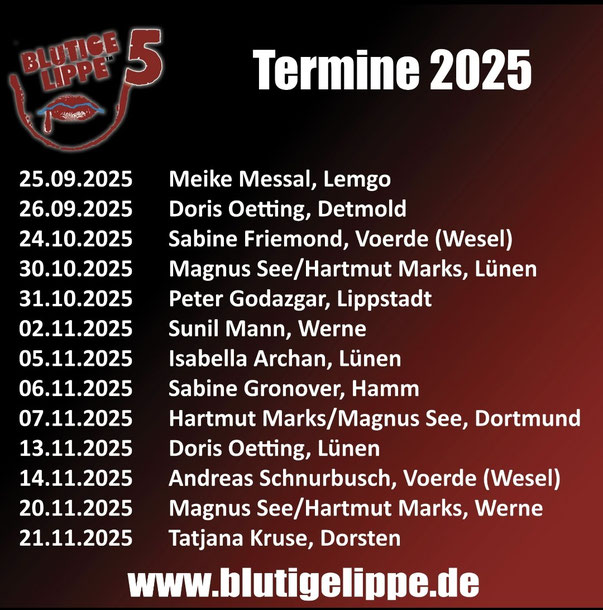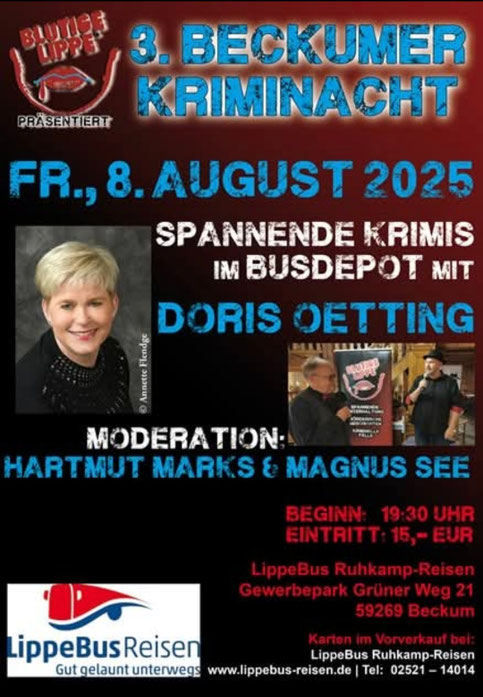 Anthologie "Blutige Lippe 5" erscheinen wird. Der Abend war einfach wunderbar und mein herzlicher Dank geht anMagnus SeeundHartmut Markssowie an Familie Schröder und das Team vonLippeBus Ruhkamp-Reisenfür die tolle Organisation an dieser außergewöhnlichen Location. Und natürlich danke ich den mehr als 80 Gästen, die gelauscht, gelacht, gekauft und zum
